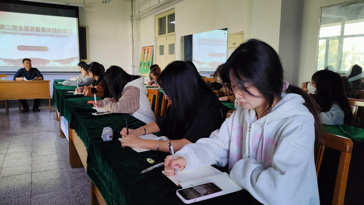 学习研讨伊始,崔巴图老师向各位同学阐述了《内蒙古自治区全方位建设模范自治区促进条例》等六部促进条例的相关内容,呼吁同学们认真学习研讨。各位同学积极听取崔巴图老师的讲解,并在笔记本上做好学习笔记。