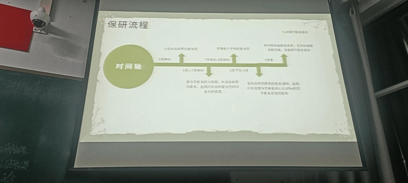 王婧睿学姐为我们从保研要求,保研途径,保研流程三个方面分享了一些经验。她强调了首先要端正思想和品行,学习成绩体质健康成绩优秀。保研流程方面,学姐以时间轴的形式向我们展示,介绍了夏令营、预推免、九推三种保研途径,以表格形式直观让我们了解了考核时间、和形式等内容。