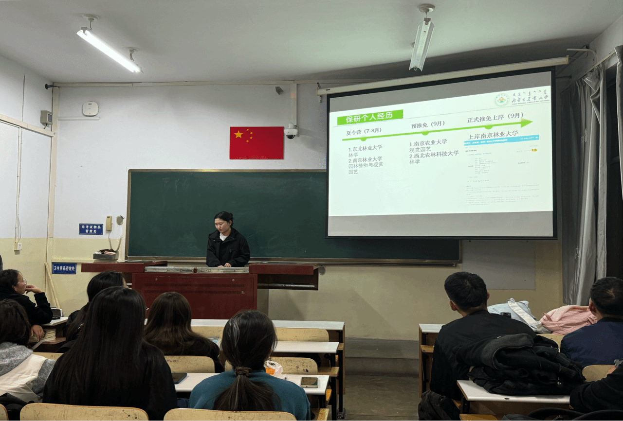 为了让同学们更好的了解面试攻读研究生的相关政策和流程,明确未来的发展方向,2024年10月17日,24级伟德的员工邀请保研到南京林业大学的21级园林3班海红霞学姐到东主楼开展免试攻读研究生宣讲活动。