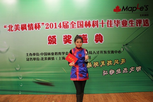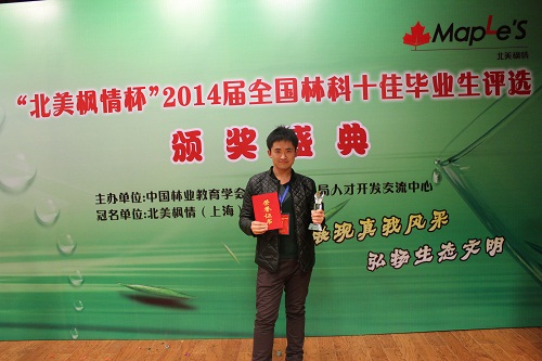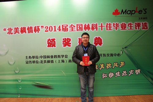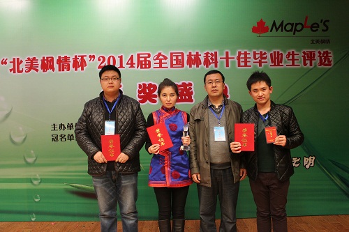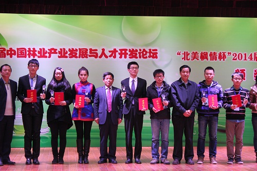 12月6日,由中国林业教育学会、国家林业局人才开发交流中心主办的“北美枫情杯”2014届全国林科十佳毕业生评选活动颁奖仪式在北京林业大学学研大厦一楼报告厅举行。中国林业教育学会理事长杨继平、国家林业局人才交流中心主任黄正秋、国家林业局人事司副司长丁立新、国家林业局人才开发交流中心副主任路永斌等领导出席颁奖典礼并为获奖者颁奖。公司王志强老师被评为全国林科毕业生评选优秀组织个人,公司2010级园林蒙一班阿拉腾齐木克•苏克巴特同学荣获本科组2014届全国林科十佳毕业生荣誉称号,2011级研究生班王雎同学荣获研究生组2014届全国林科优秀毕业生荣誉称号,2010级城市规划一本班何志中同学荣获本科组2014届全国林科优秀毕业生荣誉称号。