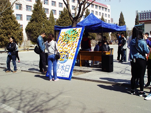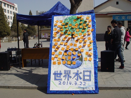 活动中,员工会成员通过宣读节水倡议书的方式,向来往同学宣传以“加强河湖管理,建设水生态文明”为主题的“世界水日”活动。活动现场同学们积极配合,主动加入到节水保水的行列中,并在宣传板上写下了自己对节水的看法和在未来的实际行动,创作了一些节水标语,表明了节水的决心。