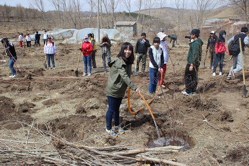 活动第一站,支部全体党员前往武川县德胜梁拜访了全国植树劳模贾登科老先生,聆听了贾登科老先生的事迹报告,召开了“老员工与全国劳模畅谈中国梦”主题座谈会。之后,全体师生在贾老先生的指引下,开展了“绿色梦想”义务植树活动。同学们在带队老师的指导下分成四组,一组负责起苗,一组负责挖坑、栽植,一组负责浇水,一组负责移栽。同学们利用所学的专业知识,经过半天的辛勤劳动,完成了种植山桃305株、丁香186株,移载油松苗268杯的工作。之后,全体师生参观了贾老先生的植树基地,并对基地树木品种和生长情况进行了调查。