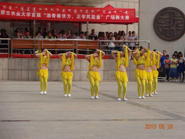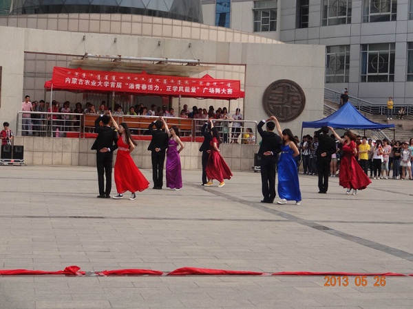 伴随着激昂的音乐,同学们整齐的跳出富有活力、激情四射的舞蹈队。用一支优雅的华尔兹做开场舞,男生非常地绅士,女生如此的优雅。接着,具有异度风情的印度舞做了衔接,穿着印度服装的女生们成了全场的亮点。最后,以热情洋溢的广场舞作结尾。这样一个年轻、青春活力的队伍赢得了在场所有观众的掌声和欢呼声。