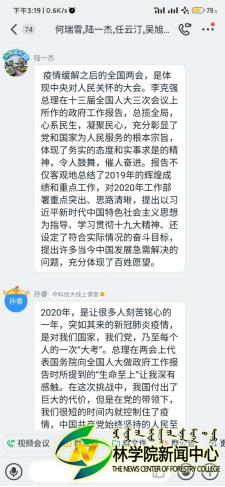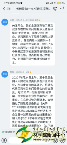为了深入学习宣传贯彻全国两会精神,引导班级团员深刻领会、准确把握两会精神实质,班级内开展了“学习贯彻全国两会精神,争做新时代有为青年”线上主题团日活动。班长组织同学们在钉钉上观看全国“两会”的视频,同学们积极交流观影感想,认识到信息飞速发展的今天,掌握了知识就等于拥有了进步的阶梯。我们要更加努力学习科学文化知识,积极开展学习创新活动,充分利用课余时间加强学习,注意积累经验。关心国家动态、国家时事。