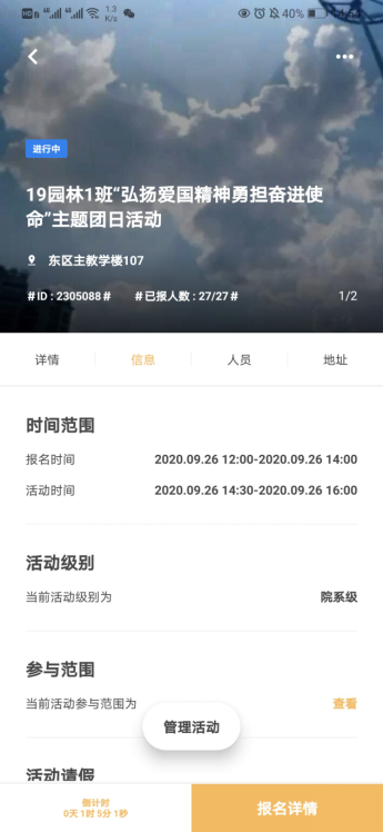 9月26日14时30分,公司2019级园林一班团支部和2019级园林二班团支部于东主107教室举行团日活动。本次团日活动主题为“爱党爱国爱家乡”,由2019级园林一班团支部和2019级园林二班团支部联合举办,本次活动共57人到场。