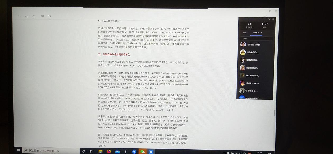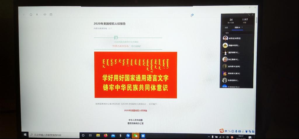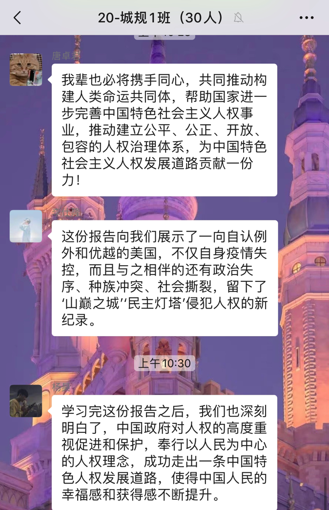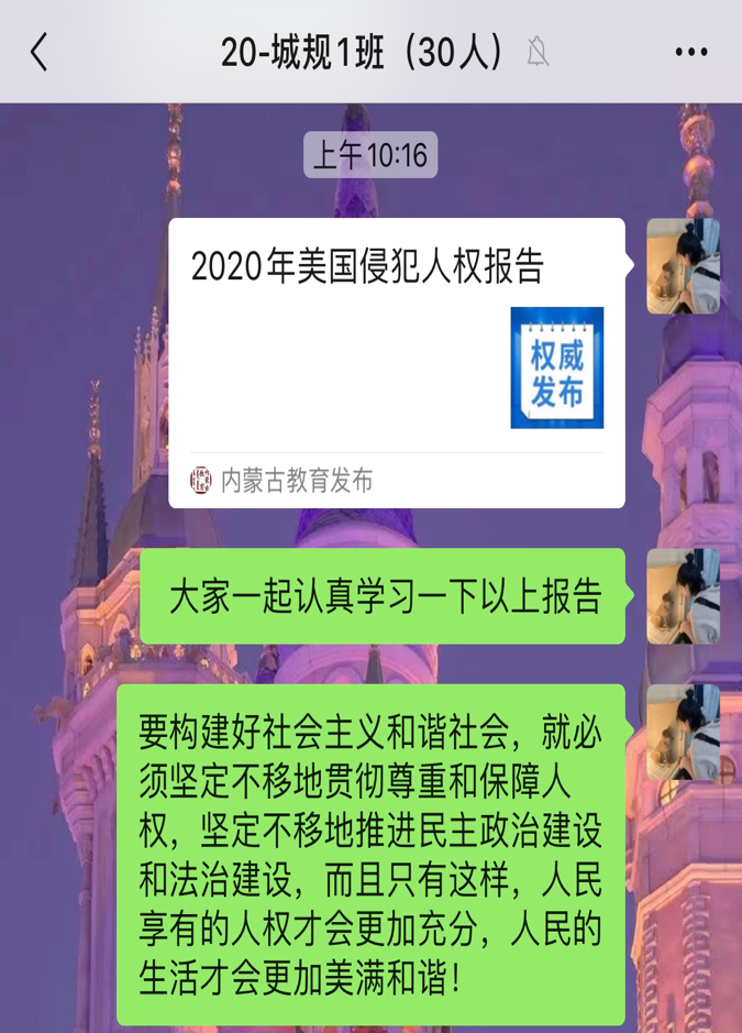 各班同学认真阅读学习由公司发布的《2020年美国侵犯人权报告》,各班团支书向同学们详细介绍了人权平等的重要意义。其中,公司部分班级通过钉钉群在线向同学们详细的讲解了报告的内容,增强同学们对社会公平的深刻印象。