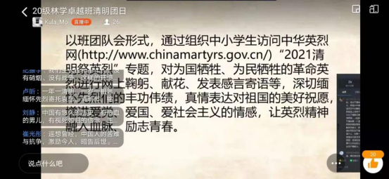 4月5日19时20分,公司2020级林学卓越班举办网上祭英烈主题团日活动。此次团日活动的成功举办,增强班级凝聚力的同时,也让同学们进一步认识到了作为新时代青年所肩负的历史重任。