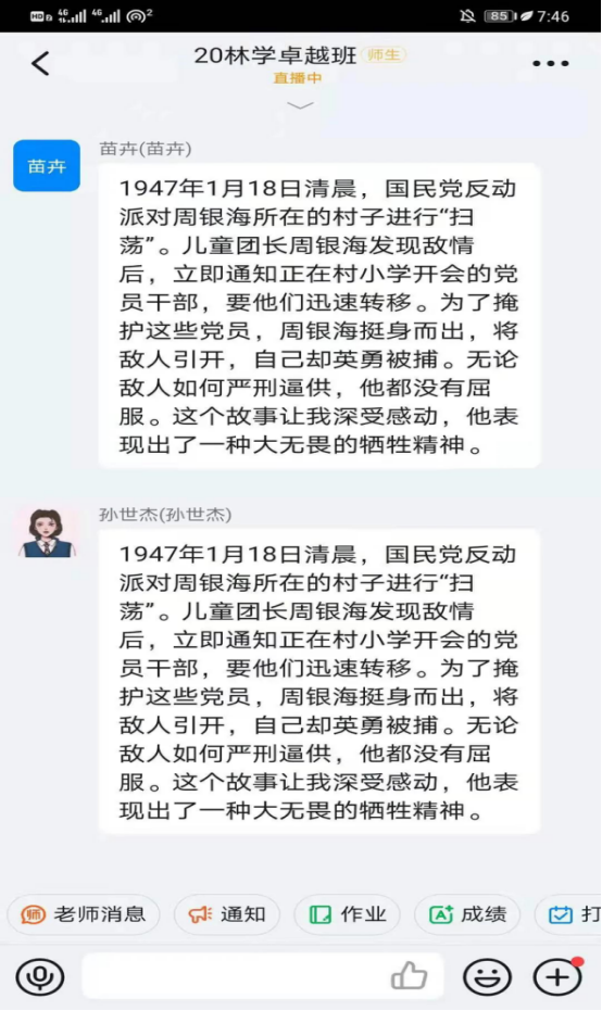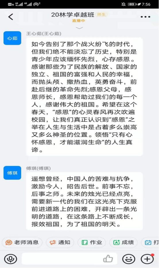 此次团会活动以钉钉线上形式举行,由本班宣传委员主持。本次活动共分为四个环节,在活动中,同学们依次进行了诗歌朗诵、历史故事回顾、唱红歌、发表感言。在回顾历史故事的时候,同学们都被为国捐躯的烈士们的事迹所感动,并表示自己一定会好好珍惜当下来之不易的幸福生活。好好学习,日后为建设祖国做贡献。张晨曦同学表示:“我们作为跨世纪的一代,面对未来,祖国的前途无限光辉灿烂,我们更应该具有爱国之情和树立报国之心。当看到一个个海外归来的游子们,用他们的知识报效我们祖国时,我们更深刻地认识到了爱国。”其他同学也轮流发表了自己的感悟。