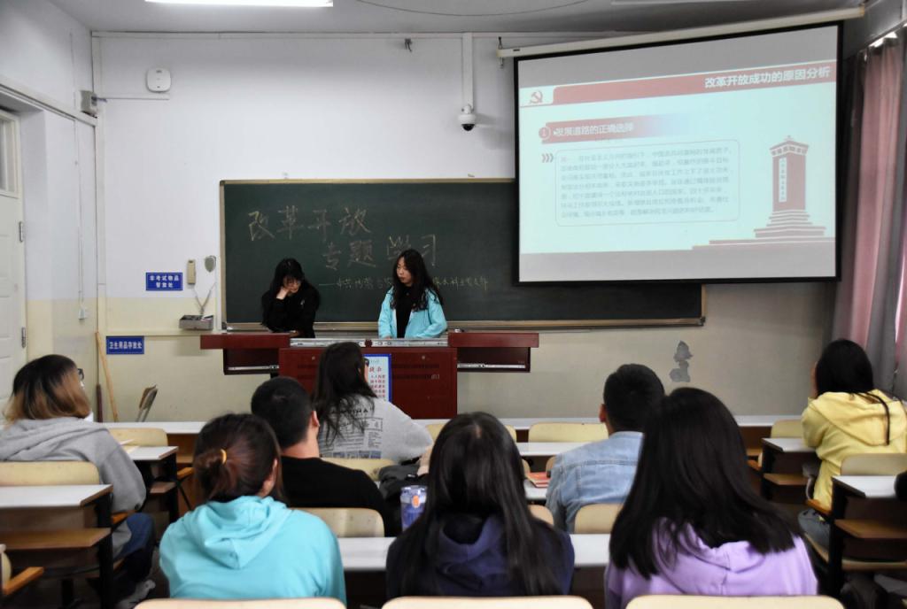 活动伊始,由主持人冯茹、张瑞姝以ppt的形式,分别从改革开放历史背景、历程、成就、以及改革开放成功的原因分析四个方面展开讲述。改革开放是中国共产党的一项“重大实践”,党的十一届三中全会上中国共产党作出了实行改革开放的历史性决策,也由此打开了中国发生历史性巨变的战略通道。主持人讲到,希望同学们吸取历史经验,不忘历史,牢记肩上使命,要通过学习改革开放的伟大历程,做到向先进看齐、向先进学习。在此活动中,党支部成员认真学习改革开放相关知识,被先辈们的毅力与情怀感染。